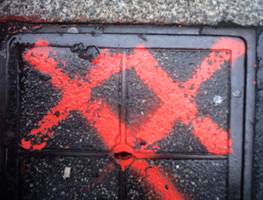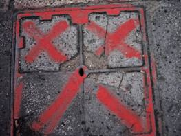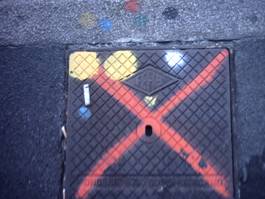 1-all’altezza dell’edicola: tombino con segno X blu e punti gialli-