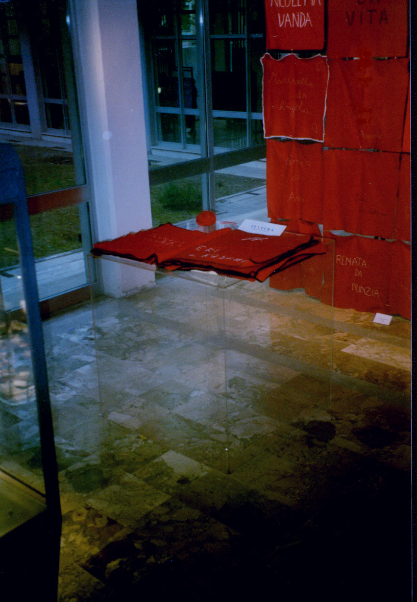 I quadrati tessili prevedevano infatti: la realizzazione e l’invio all’artista di un quadrato di cm. 60 x 60; “tessuto” nella tecnica preferita maglia, uncinetto, telaio, punto croce, intreccio, e così via Possibilmente in lana o misto lana, di colore rosso, un bel rosso rubino, rosso vino, rosso sangue. Sotto-scritto - con ago e filo bianco - il proprio nome e quello della madreo della persona che ci ha allevato …