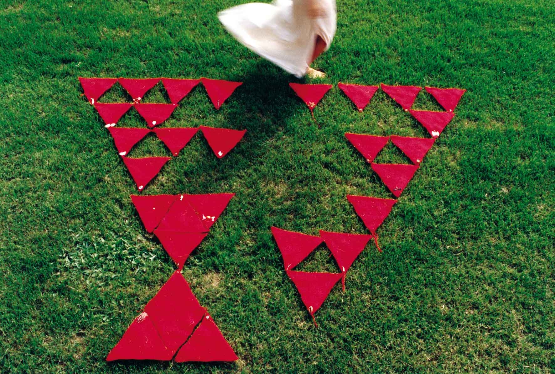 Imaginifica,a Living Sculpture in Textile Art, Land Art,Public Art, Arte Coinvolgente Basilicata, 1-28 agosto 1999 Nella Sala della tessitura sacra Il Triangolo con la punta in giù è l’archetipo che più efficacemente rappresenta la pura energia del Femminile.