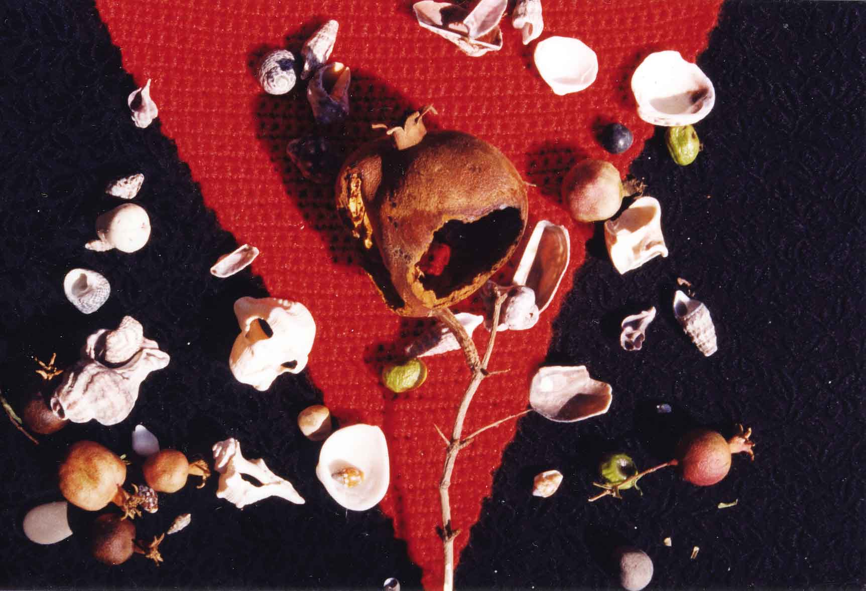 Preziosità del femminile Con filo rosso di lana l’Artista ha realizzato ventotto Sculture Tessilia forma triangolare. Ha poi completato l’Opera “personalizzando” i triangoli, applicando ad ognuna delle sculture tessili deiparticolari in oro, argento, argento antico, filigrana, pietre dure, perle, medaglie, petali di rosa, fiore tigrato di pianta grassa, gusci dimandorla ed altri materiali .. 28 i giornidi impegno assolutamente ininterrotto, nelmese di agosto 1999,al fine di “tessere” un triangolo al giorno, l’Azione simbolica di struttur/azione essendolegata al ciclo lunare/mestruale. In seguito l’opera è stata protagonista di diverse Performances, Installazioni e Composizioni in open air, su spiaggia sabbiosa, prato, alberi, etc. Anche su blog: http://terivolini.blogspot.it/2009/07/imaginifica-living-sculpture.html Anchesublog link con pagina dedicata a Gimbutas: http://terivolini.blogspot.it/2014/02/omaggio-marja-gimbutas-per-il.html