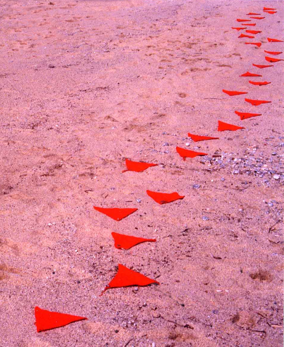 | Imaginifica, a Living Sculpture Tracce che vengono da molto lontano Installazione delle 28 sculture tessili su spiaggia sabbiosa- Azione simbolica in arte coinvolgente S. Maria di Ricadi,Calabria,autunno 1999 |