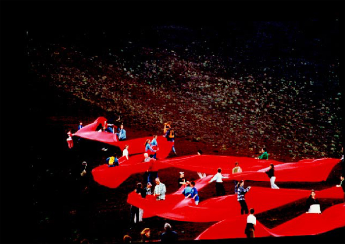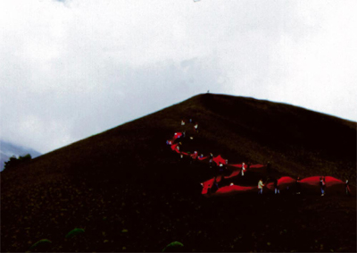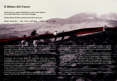 Turchia, Malta...). Questo Viaggio, inziato sulla montagna Vulcanica - sede magica di primordiali alchimie - è "La Danza della Corda ". II Serpente che il Nastro Rosso ha qui disegnato simboleggia, col suo uscire in superficie dopo un lungo letargo e con il mutare periodicamente la pelle, il Risveglio dell' Energia Vitale assopita e la necessità della trasformazione nella continuità della Vita. Questo "cordone ombelicale", in connessione con il fiume di lava e con l'elemento Fuoco, oltre a propiziare la liberazione e l'espansione della forza vitale, ed essere quindi fonte di illuminazione e di guarigione, ricongiunge l'Artista ed i partecipanti all Evento al comune, antichissimo passato; ricollega le donne alle loro antenate, perché possano, ri-cordando, ricostituire l' integrità del Femminile; ricongiunge tutti noi alla Madre Terra, alla sua terribile, aspra bellezza, e tramite la presenza della Luna, ai cicli cosmici e all'Universo. |