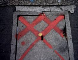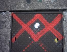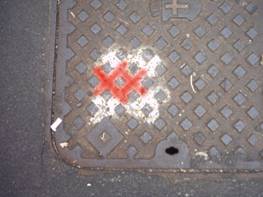1-all’altezza dell’edicola: tombino con segno X blu e punti gialli-