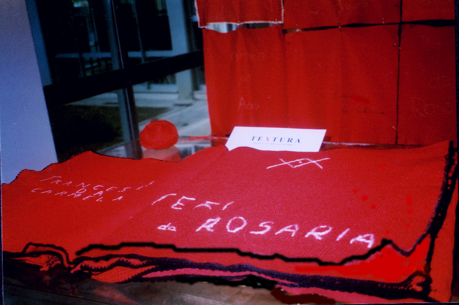 LA PORTADELLA VITA,a Living Sculpture Grande pannello mt 3 x3 ca, con “ pezzotte” rosserealizzate in modalitàalternativa,in quanto nell’invito alprogetto l’artista comunicava: Al progetto hanno partecipato anche gli allievi di varie scuole superiori di Potenza,coinvolti daTeri Volini come visiting professor per Opera Prima,tramite una installazione - video - azione preparatoria per Textura econferenza. Essesono state poi utilizzate per la Esposizionein Artetessile, Public art, arte coinvolgente: presso il Museo provinciale di Potenza, 14-30 maggio 2002, comprendente unaduplice installazione,La Portadella vita e Textum