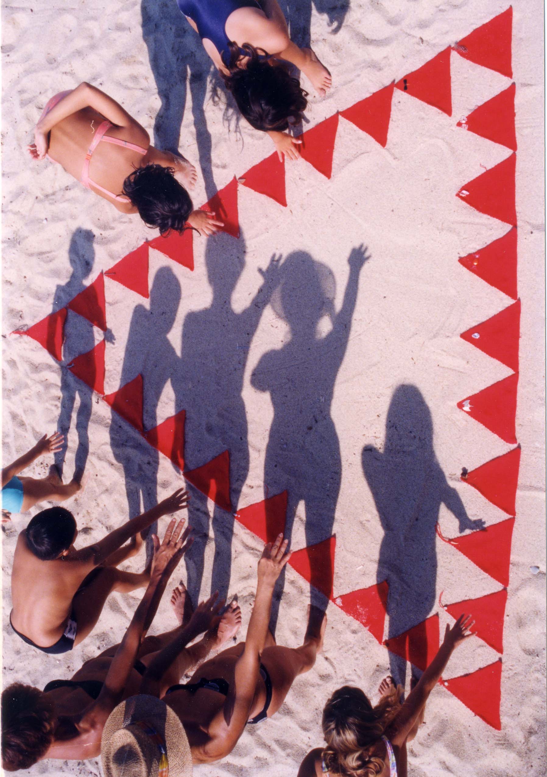 | Imaginifica, a Living Sculpture Tracce che vengono da molto lontano Installazione delle 28 sculture tessili su spiaggia sabbiosa- Azione simbolica in arte coinvolgente S. Maria di Ricadi,Calabria,autunno 1999 |