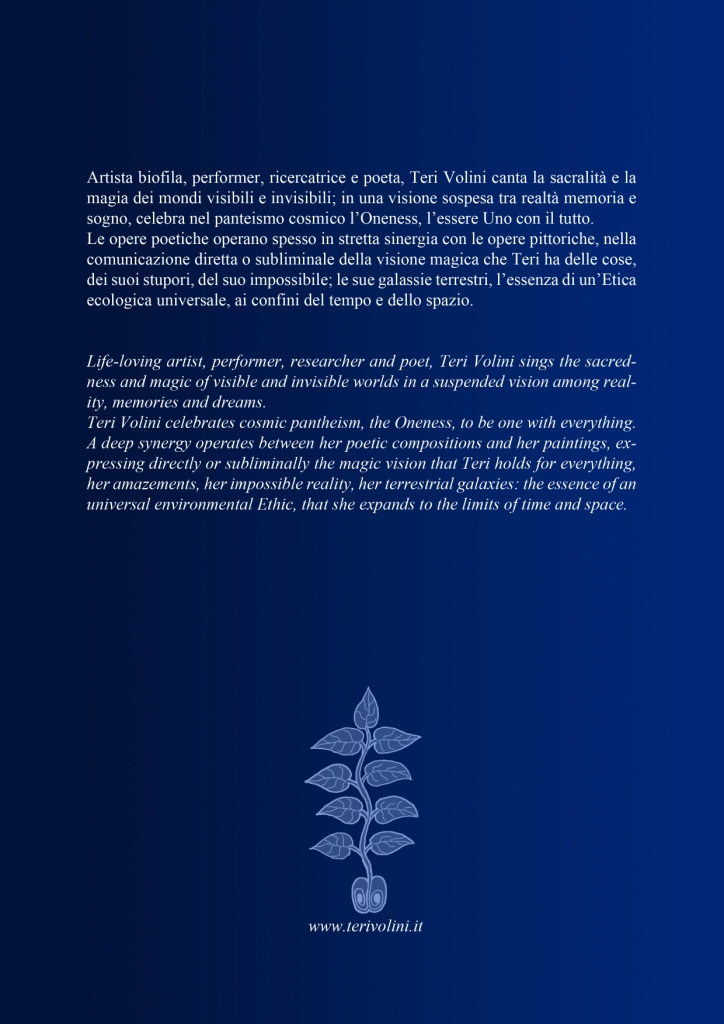 Introduzione alla raccolta poetica: Artista biofila, pittora, performer, ricercatrice, linguista, come poeta Teri Volini canta la sacralità e la magìa dei mondi visibili e invisibili. Profondamente sensibile all’umana sofferenza ed alla compassione, che attiene anch’essa all’Oneness, essere Uno con il tutto, Teri ne tocca alcuni aspetti con grande pudore, inserendo nei testi poetici delle note drammatiche, a volte nascoste, spesso acutissime, ad esclusivo uso della sensibilità di chi si presti a percepirle e ad apprezzarle. Un po’ come accade nei suoi quadri, spesso Teri riveste i versi con un Velo, rendendo possibile l’Ingresso solo a coloro che sono pronti ad inoltrarvisi per godere della profonda emozione e bellezza del suo Canto … Delta Edizioni 2015