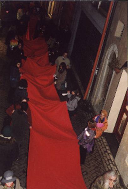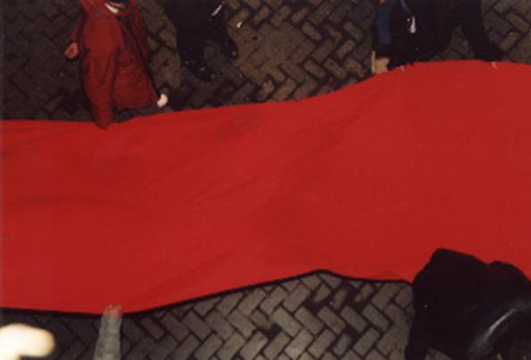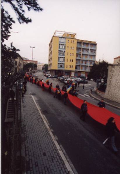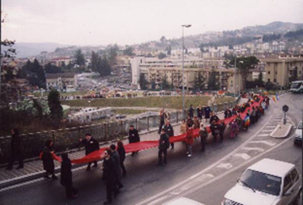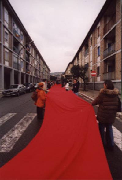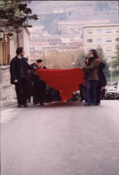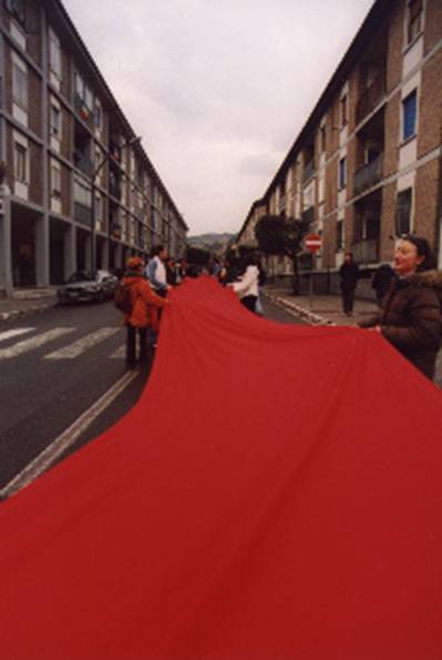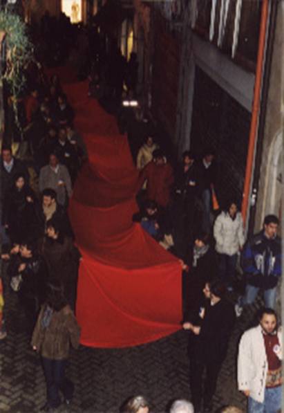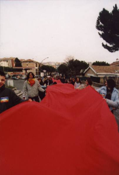 Nastro Rosso in cotone di mt. 180 largo mt. 2 E' stata proposta ed evidenziata l'improrogabilità della concretizzazione dei valori connessi alla Vita, tramite il Nastro Rosso già dispiegato nel 1999 sull'Etna per simboleggiare il Risveglio dell'Energia Vitale assopita e la necessità della trasformazione nella continuità della vita. Il Nastro Rosso ha consegnato il suo messaggio scorrendo nelle strade della città, portato a mano da centinaia di persone, come una sorta di fiume inarrestabile che esprimeva, chiedeva, esigeva attenzione per i valori di cui è portatore, e che in questo momento pretende la fine del conflitto e la soluzione dei problemi ad esso collegati con altre vie che tengano presente la necessità di giustizia, sicurezza e di libertà per tutti i popoli. Il Nastro Rosso è un potente simbolo archetipo che dovrebbe renderesuperfluo l'uso delle parole, soprattutto di fronte ad eventi di estrema gravità come quello attinente alla guerra… La manifestazione è iniziata alle 16. 30 in P.zza Bologna; il corteo ha percorso via Milano, ponte Di Giura, via Lazio, via Pretoria, con arrivo in Piazza Prefettura. Il Nastro Rosso, una delle prime cifre stilistiche dell'artista, è un potente costruttore di simboli, che disegna preferibilmente in grandi dimensioni soprattutto in natura: il Serpente purpureo sull'Etna , la Ragnatela in più luoghi partendo dalla Basilicata, Il Labirinto, Il Cuore Ferrato, La Spirale della Rinascita, il Mandala Aureo etc. …sensibilizzare l’opinione pubblica sulla gravità della situazione in cui la guerra ci pone …stimolare la riflessione sulla necessità di evitare l’indifferenza, l’apatia, l’egoismo… …non rimanere concentrati soltanto nel piccolo della nostra esistenza quotidiana, quando invece è sempre più necessario il senso di un collegamento più vasto. L’imponenza dell’Opera favorisce la visibilità, e attraverso lo stupore focalizza l’attenzione e stimola la ricerca dei significati di cui essa stessa è portatrice. Così l’enfatizzazione del medium comunicativo, non essendo nata dal narcisismo dell’artista ma da più profonde esigenze, non rispondendo al sensazionalismo fine a se stesso ma da un autentico sentire, diventa mezzo privilegiato di trasporto di stimoli vivi, indispensabili per il cambiamento degli atteggiamenti automatizzati di ognuno di noi. Il Nastro Rosso, potente simbolo archetipo, trasmettitore di messaggi, di emozioni e di richieste: esso stesso è Il Messaggio. |